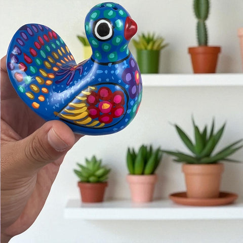 Meet your new table companion—a whimsical dove-shaped salt and pepper shaker that's as delightful to look at as it is to use. Each piece is wonderfully one-of-a-kind, bursting with vibrant colors that instantly transform your dining setup into something special. Perfect for adding a splash of personality and charm to every meal, this playful little bird brings joy and seasoning in equal measure.