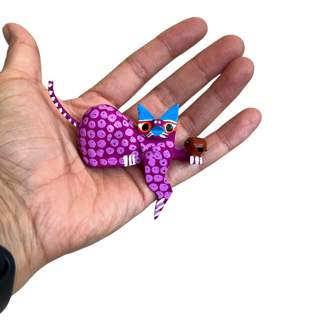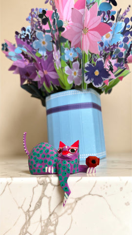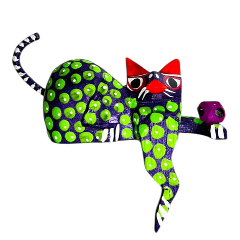 Alebrijes are part of a vibrant folk art tradition from Oaxaca, Mexico, where artisans carve imaginative animals from copal wood and paint them with intricate designs and bold colors. Each piece is made entirely by hand, making every cat unique.