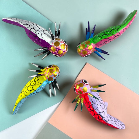Each piece is hand-carved and hand-painted, making every Alebrije unique. The playful designs reflect the creativity and heritage passed down through generations of Oaxacan artisans.