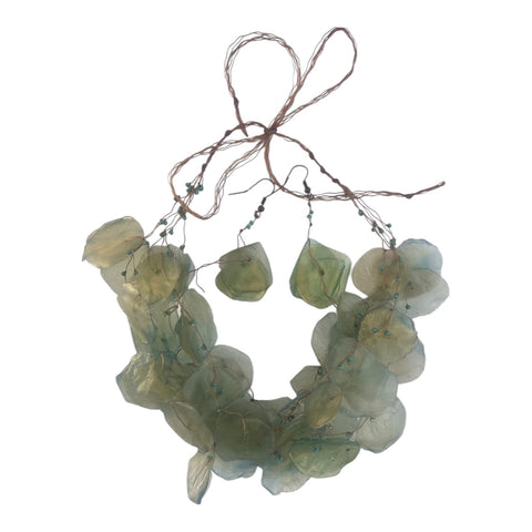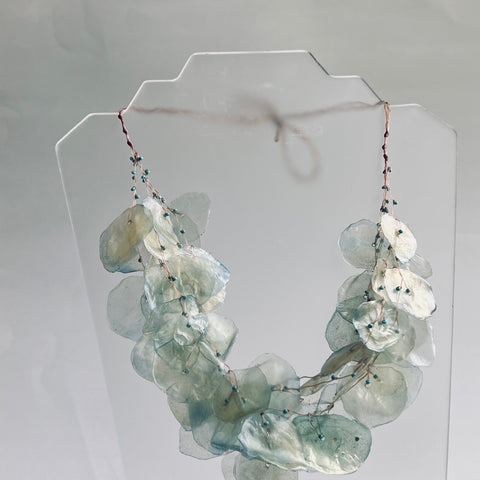 Each Necklace is One of a Kind. The Fish Scales are properly cleaned, then lacquered and Painted. Creating a true work of art, and a unique, light-weight, versatile Necklace that can be worn long or short or even as a Hair Ornament.