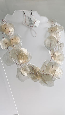 Each Necklace is One of a Kind. The Fish Scales are properly cleaned, then lacquered and Painted. Creating a true work of art, and a unique, light-weight, versatile Necklace that can be worn long or short or even as a Hair Ornament.